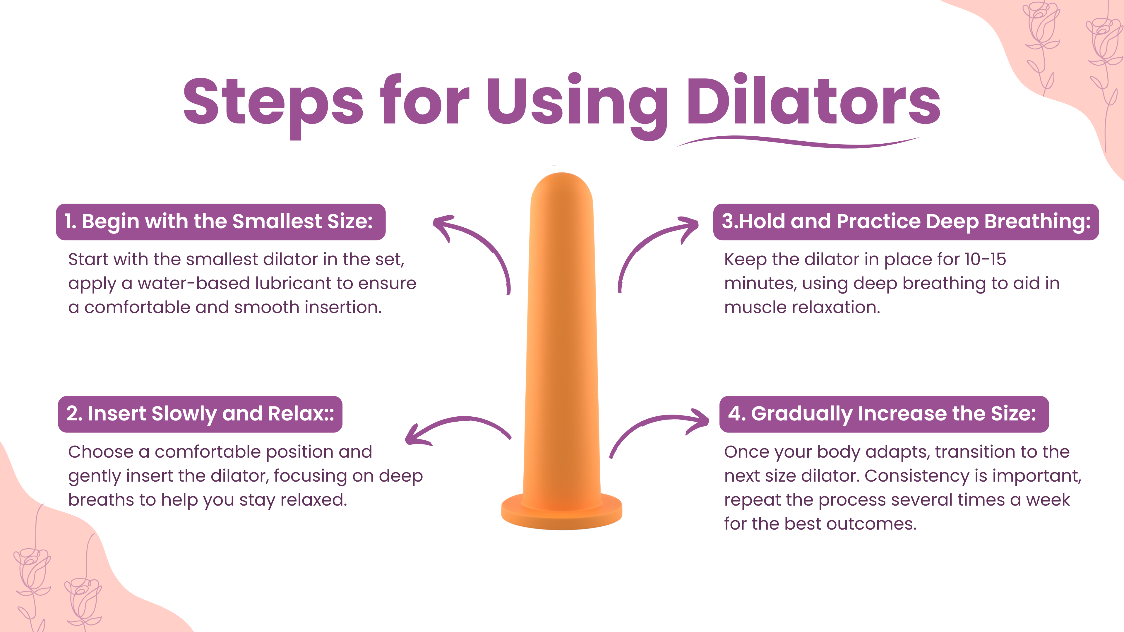 To use pelvic dilators, apply lubricant and start with the smallest one, gradually increasing in size over time. Use them regularly or as needed to relax pelvic muscles and reduce discomfort. Always follow your healthcare provider’s guidance.